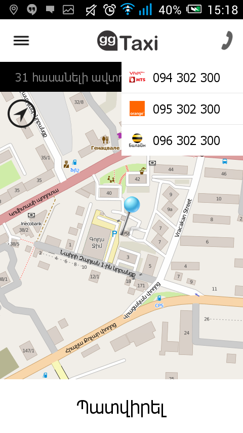 Վերևի աջ անկյունում կա հեռախոսի նշանը, որի միջոցով Դուք կարող եք կապնվել ggtaxi օպերատորի հետ և ուղղել նրան Ձեզ հետաքրքրող հարցերը: