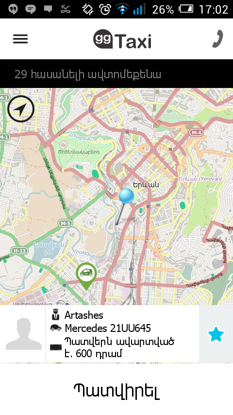 Այնուհետև 2 կմ շառավղի վրա գտնվող վարորդներից մեկը վերցրնում է պատվերը և Դուք կարող եք տեսնել նրա անունը, ավտոմեքենայի համարանիշը, գույնը: Մոտ ապագայում կտեսնեք նաև վարորդի լուսանկարը: