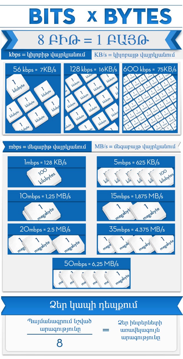 Ինտերնետ կապի գովազդներում հիմնականում արագությունները նշվում են Կբ/վ-ով կամ Մբ/վ-ով, սակայն դա սխալ չափման միավոր է: Կբ/վ չափմանը միավորը ցույց է տալիս մեկ վայրկյանում ընդունվող կամ ուղարկվող կիլոբայթերի քանակը, իսկ Կբիթ/վ՝ կիլոբիթերի քանակը: Օրինակ, եթե օպերատորը խոստանում է տրամադրել 1Մբ/վ արագությամբ ինտերնետ, ապա նա դրա տակ հասկանում է 1Մբիթ/վ, որով հնարավոր է ներբեռնել ֆայլեր 128 կիլոբայթ/վայրկյան արագությամբ, իսկ բաժանորդը հասկանում է 1 Մբ/վ, որով նա մի վայրկյանում կարող է ներբեռնել 1 Մեգաբայթ: